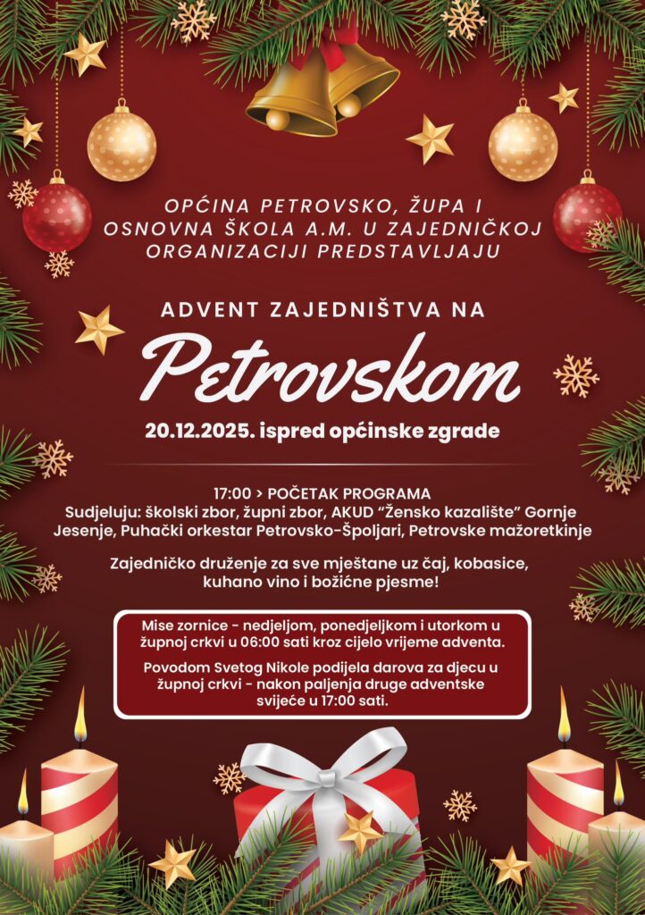 Općina Petrovsko, Župa Petrovsko i Osnovna škola A.M. pozivaju sve mještane na blagdansko okupljanje “Advent zajedništva na Petrovskom”, koje će se održati 20. prosinca 2025. ispred općinske zgrade, s početkom u 17 sati.
