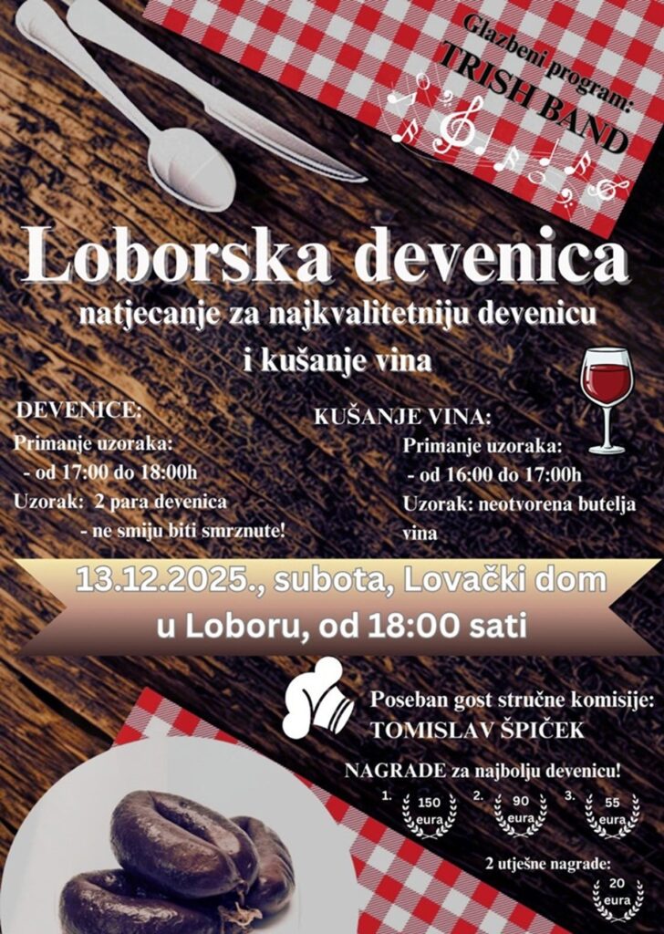 Općina Lobor i ove godine poziva sve ljubitelje domaćih delicija, druženja i bogate zagorske tradicije na ‘Loborsku devenicu’, manifestaciju koja je s godinama postala jedno od najprepoznatljivijih okupljanja u ovom dijelu Zagorja. Subota, 13. prosinca, rezervirana je za mirise, okuse i veselu atmosferu u prostoru Lovačkog doma, s početkom u 18 sati.