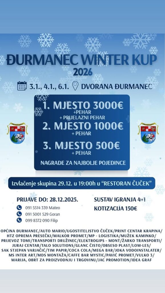 Prvi malonogometni turnir ‘Đurmanec Winter Kup 2026.’ privukao je veliko zanimanje jer je prijavljeno čak 27 ekipa, što je iznenađujuća brojka jer se nekako uvriježilo da na ovakvim turnirima posljednjih godina brojka dolazi do 20, s nekoliko iznimaka kao što su primjerice ljetni turniri u Gornjem Jesenju i Đurmancu.