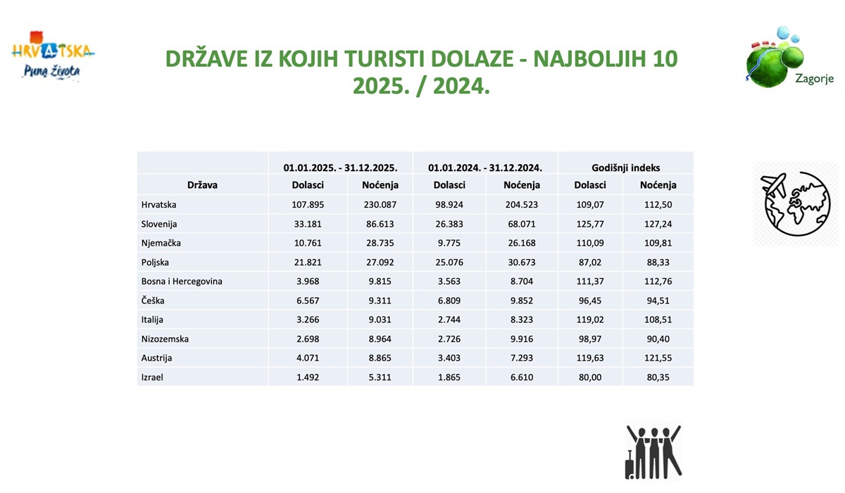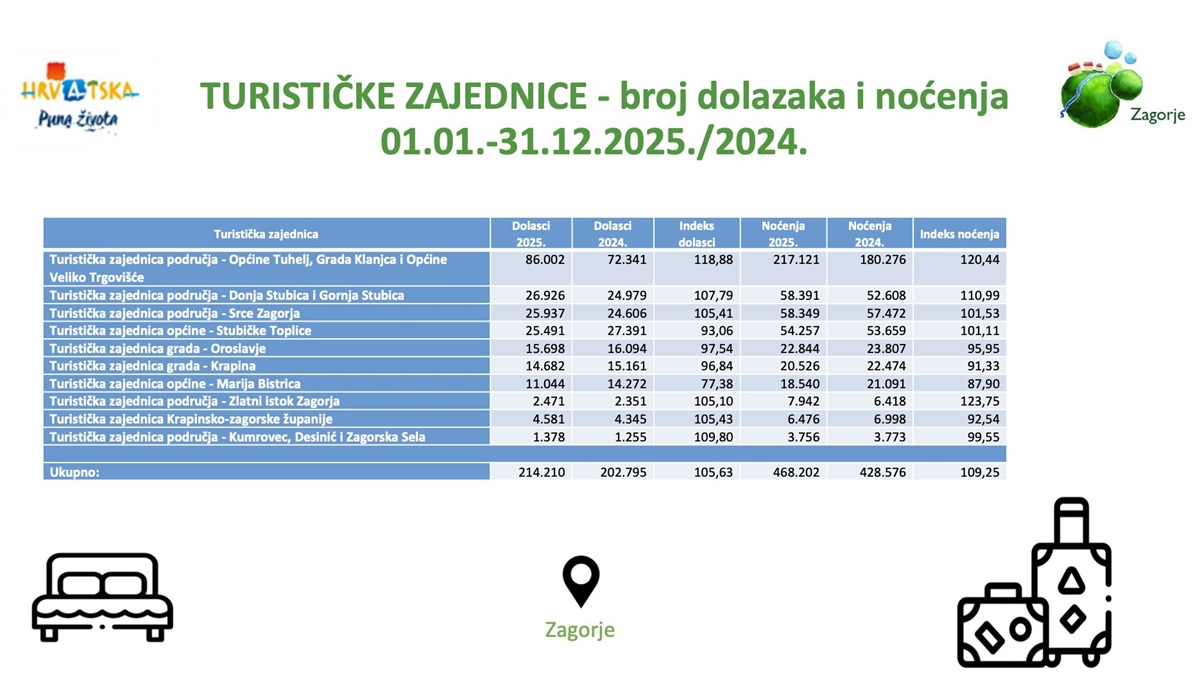 Krapinsko – zagorska županija lani je zabilježila ukupno 214.210 dolazaka turista, gotovo podjednako domaćih i stranih. Ukupno je zabilježeno 468.202 noćenja, od čega su domaći gosti ostvarili 49, a strani 51 posto. Broj dolazaka povećan je za 5,6 posto, dok je broj noćenja porastao za 9,2 posto.