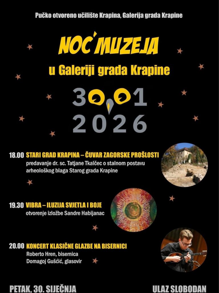 Galerija grada Krapine i ove godine, u petak 30. siječnja, sudjeluje u ‘Noći muzeja’! Galerija će postati mjesto živog susreta likovne i glazbene umjetnosti te povijesti i arheologije.