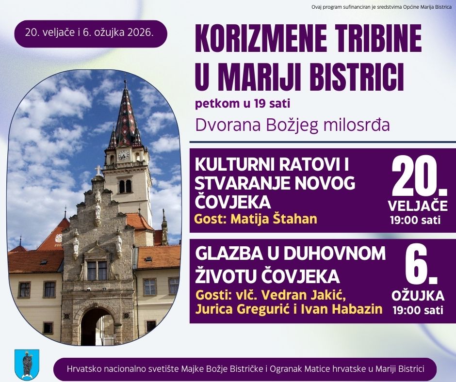 Ogranak Matice hrvatske u Mariji Bistrici i Hrvatsko nacionalno svetište Majke Božje Bistričke i ove godine nastavljaju dugogodišnju tradiciju korizmenih tribina, koje okupljaju vjernike i zainteresiranu javnost na promišljanje društvenih, kulturnih i duhovnih tema, piše Radio Marija Bistrica.