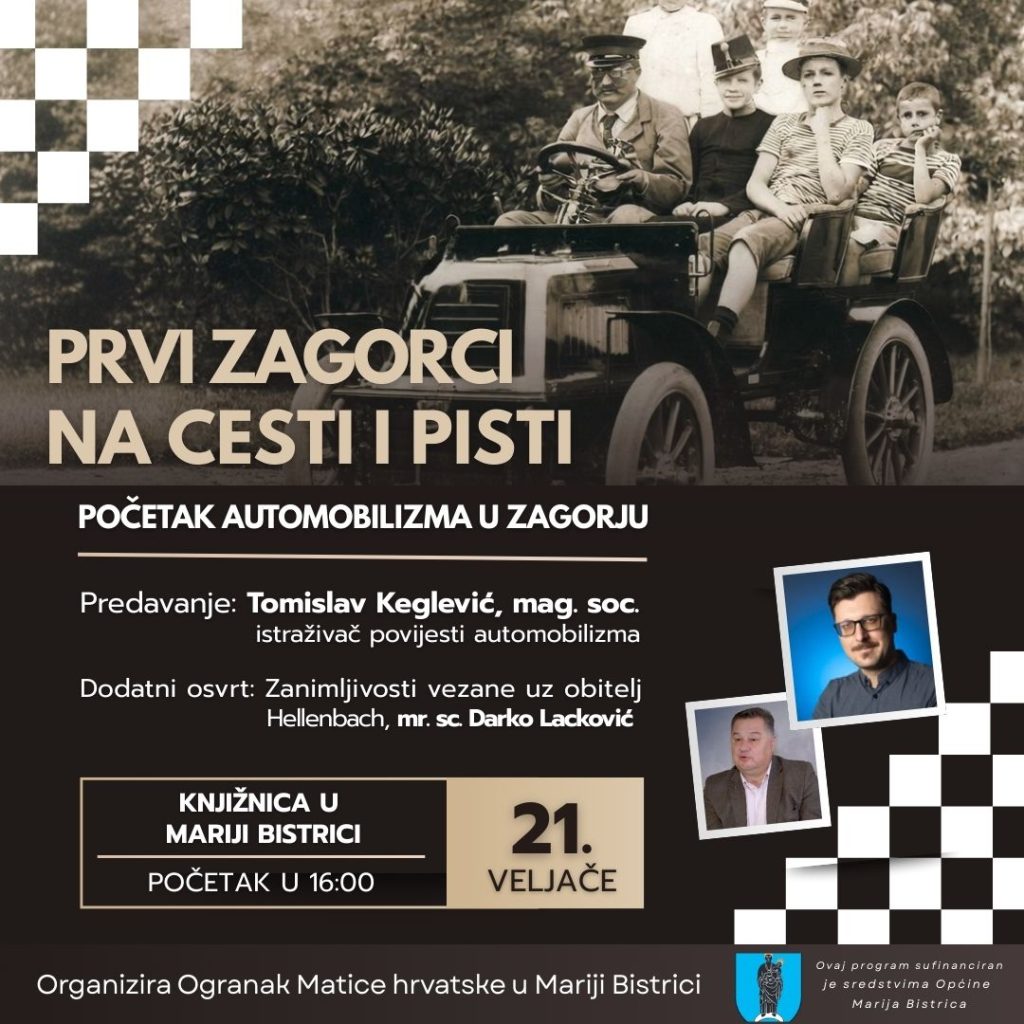 Uz korizmene tribine, Ogranak Matice hrvatske u Mariji Bistrici organizira i predavanje ”Povijest automobilizma u Zagorju: Prvi Zagorci na cesti i pisti”, koje će se održati ove subote s početkom u 16 sati u Općinskoj knjižnici i čitaonici Marija Bistrica.