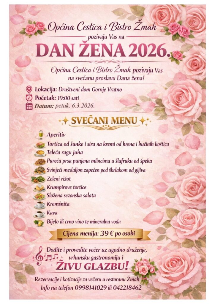 Općina Cestica i Bistro ‘Žmah’ pozivaju na svečanu proslavu Dana žena 2026. godine koja će se održati u petak, 6. ožujka, s početkom u 19 sati u Društvenom domu Gornje Vratno.