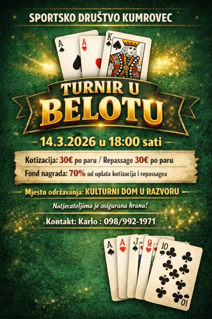 Sportsko društvo Kumrovec organizira turnir u belotu koji će se održati u subotu, 14. ožujka 2026. godine s početkom u 18 sati. Turnir će se igrati u Kulturnom domu u Razvoru, a organizatori pozivaju sve ljubitelje kartaških igara da se prijave i okušaju u natjecanju.