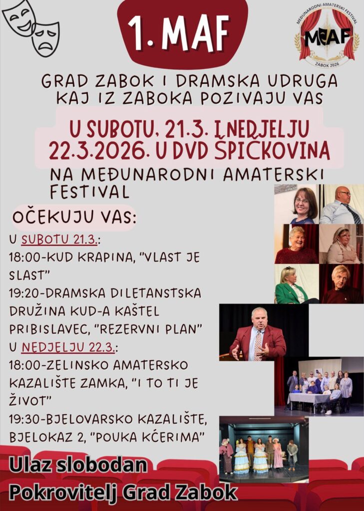 Grad Zabok i Dramska udruga ‘Kaj’ pozivaju vas na 1. međunarodni amaterski festival koji će se održati u subotu i nedjelju, 21. i 22. ožujka, u prostorijama DVD-a Špičkovina s početkom u 18 sati!