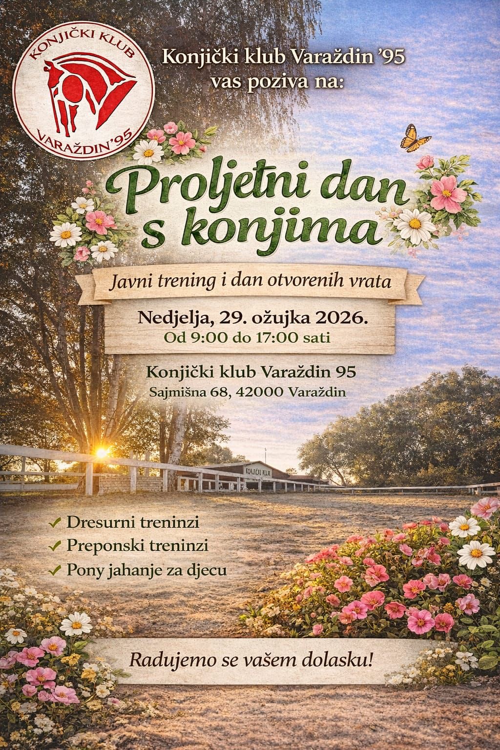 Konjički klub Varaždin ’95 poziva sve zainteresirane na Proljetni dan s konjima, koji će se održati u nedjelju, 29. ožujka, od 9 do 17 sati, na adresi Sajmišna 68, Biškupec.