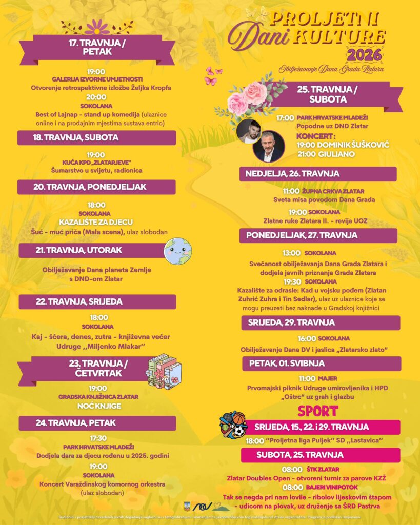 Povodom Dana grada Zlatara, u grad stižu ‘Proljetni dani kulture’! Grad Zlatar oživjet će uz umjetnost, glazbu i druženje, a program će trajati od 17. travnja do 1. svibnja!