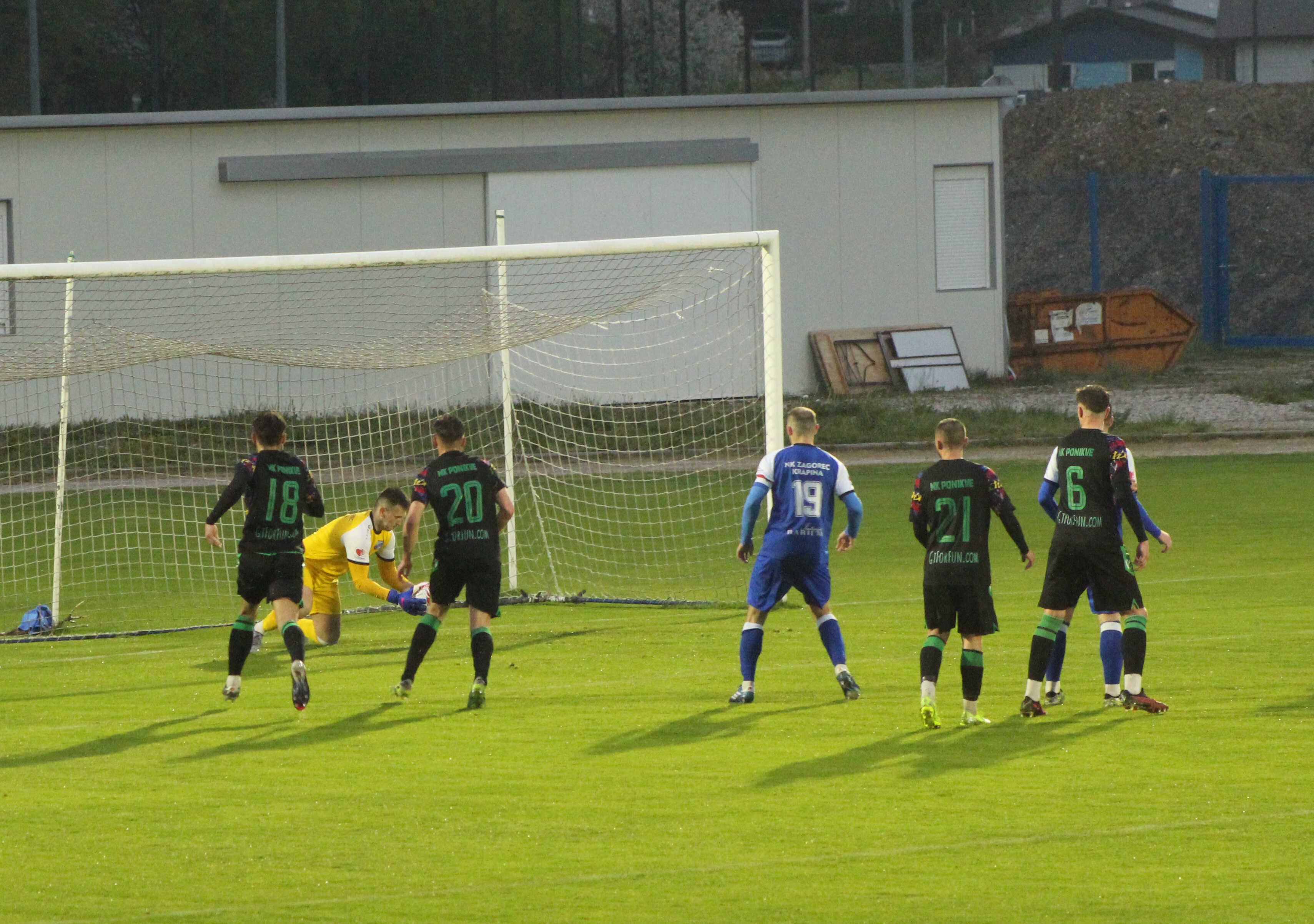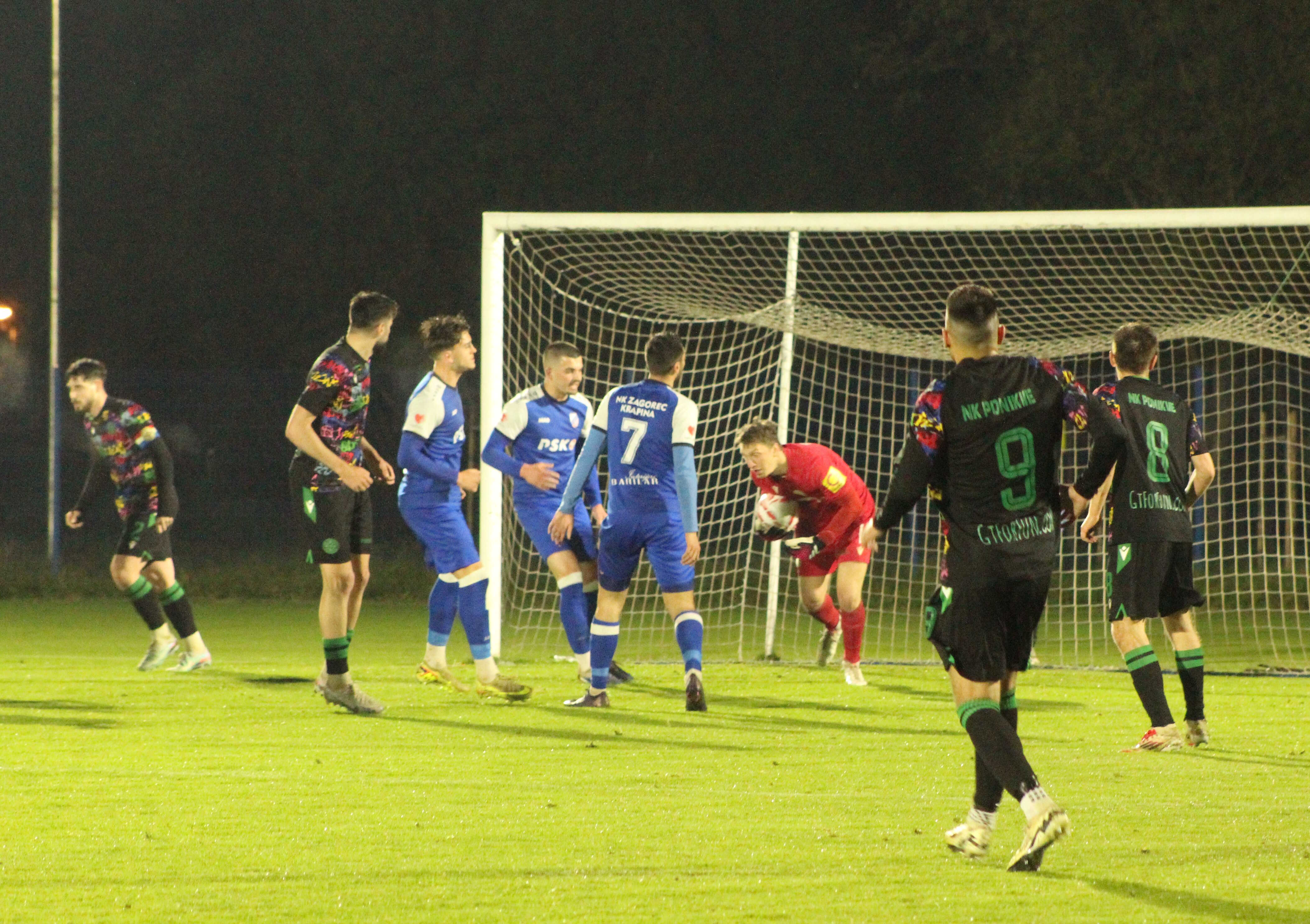 Već tri minute kasnije velika prilika za Zagorec – Stiperski probija desnu stranu obrane Ponikvi i upućuje loptu prema drugoj stativi gdje ju pokušava u klizećem startu Jura Štimac ubaciti u mrežu, ali kako je lopta bježala od njega, ne uspijeva i rezultat ostaje nepromijenjen. Nakon uvodnih desetak minuta i dobre igre Zagorca pomislili smo – bit će to igra mačke i miša, ali tako nisu mislili igrači Ponikvi koji su se pokrenuli i preuzeli inicijativu te počeli opasno ugrožavati gol domaćina. Bila je prilika, ali je obrana Zagorca uspijevala to nekako otkloniti da bi ipak u 25. minuti iz opravdano dosuđenog jedanaesterca preko Brkića gosti došli do zasluženog izjednačenja.
