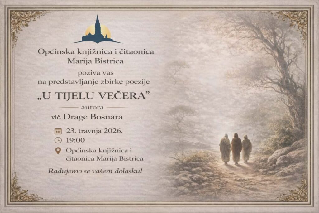 U sklopu ovogodišnje manifestacije Noć knjige, Općinska knjižnica i čitaonica Marija Bistrica organizira književno predstavljanje zbirke poezije “U tijelu večera“ autora vlč. Drage Bosnara. Događaj će se održati u četvrtak, 23. travnja, s početkom u 19 sati, piše Radio Marija Bistrica.