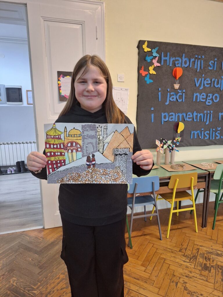U skladu s propisanom tematikom natječaja, nagrađena učenica i njezina učiteljica, u suradnji s ravnateljicom škole, odlučile su da likovni rad tematski prikaže ljubav prema domovini. Rad je izrađen kombiniranjem više likovnih tehnika – kolaža, akvarela i tempere, dok je flomaster, kao crtačka likovna tehnika, korišten za naglašavanje kontura i isticanje ključnih elemenata kompozicije, čime je postignuta jasna vizualna struktura i izražajnost likovnog rješenja.