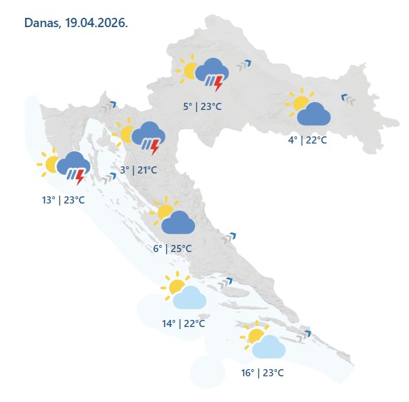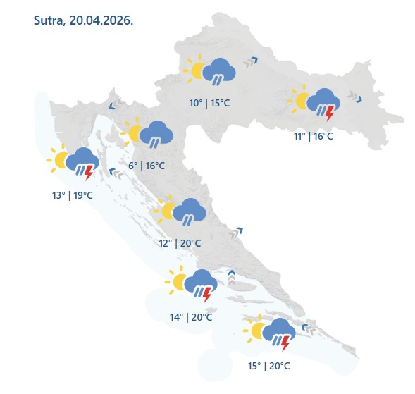 Promjenjivo oblačno, mjestimice uz kišu i grmljavinu, prolazno i pojačan vjetar. Sunčana razdoblja bit će češća na Jadranu. Slab do umjeren sjeveroistočni i sjeverozapadni vjetar popodne na sjeveru u okretanju na jugozapadni. Na Jadranu slabo i umjereno jugo i južni vjetar, a navečer na sjeveru bura. Najniža temperatura zraka između 7 i 11, na moru od 11 do 14 °C. Najviša dnevna između 15 i 20 °C.