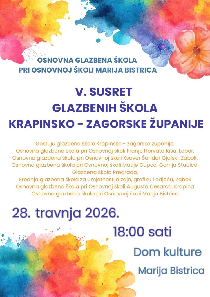 Glazbena škola pri OŠ Marija Bistrica organizira V. Susret glazbenih škola Krapinsko- zagorske županije. Cilj susreta je povezivanje škola, izmjenjivanje nastavničkih i učeničkih iskustava te pružanje učenicima mogućnost održavanja koncerata diljem Krapinsko – zagorske županije, piše Radio Marija Bistrica.