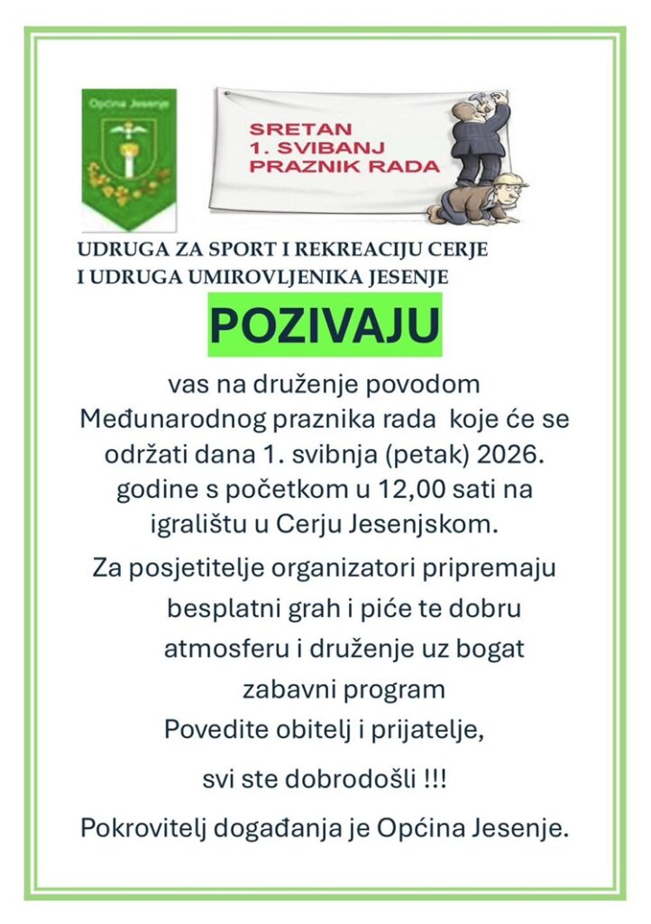 Proslava Međunarodnog praznika rada održat će se u petak, 1. svibnja, na igralištu u Cerju Jesenjskom s početkom u 12 sati. Organizatori događanja su Udruga za sport i rekreaciju Cerje i Udruga umirovljenika Jesenje, uz pokroviteljstvo Općine Jesenje.